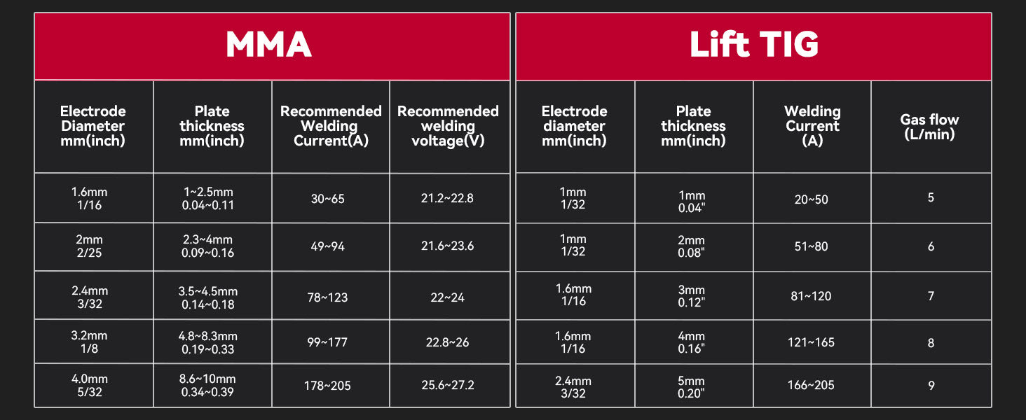 Supports 6010, 6011, 6013, and 7018 rods, including cellulose electrodes — suitable for structural, home repair, and farm work. Tip: Bake 6010/6011 rods for better arc stability. - Stick & Lift TIG 2-in-1 Welding: Supports both Stick and Lift TIG welding (TIG torch not included), giving you more flexibility for different welding tasks.
