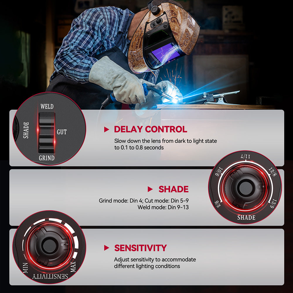 Advanced Auto-Darkening Filter — Equipped with 4 high-sensitivity arc sensors and adjustable shade settings (DIN4 light state, DIN5-9/9-13 dark state) for ARC/MIG/TIG welding in various environments.