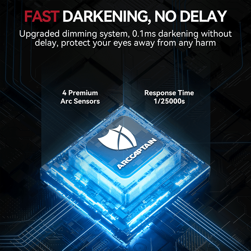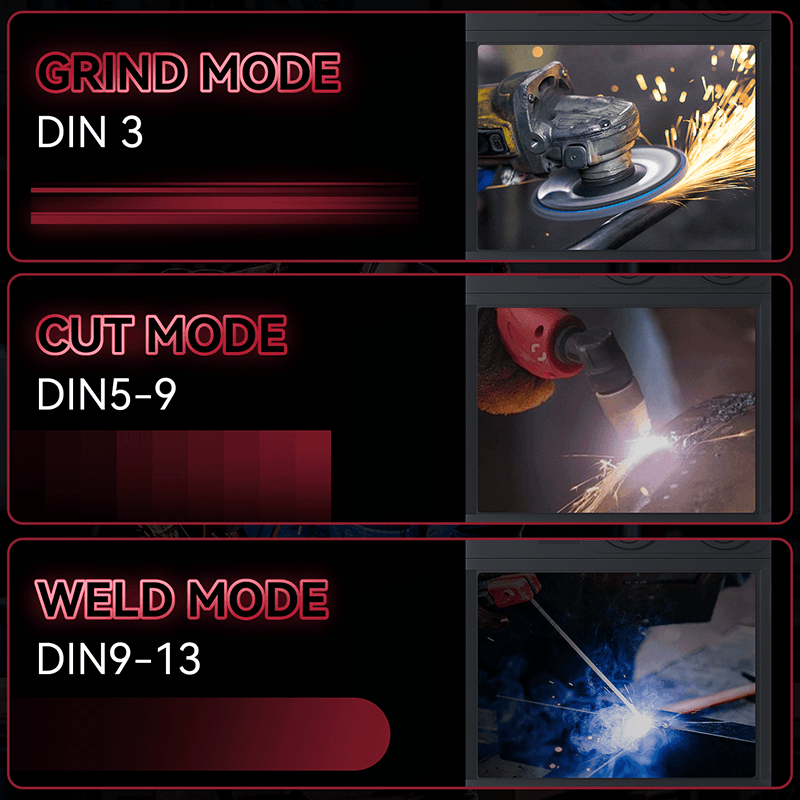 Filtre à obscurcissement automatique : ce casque de soudage avec vue latérale est doté d'une lentille à obscurcissement automatique de haute qualité et de 4 capteurs d'arc avancés. Il vous permet de vous adapter à différents environnements de travail en ajustant la teinte et la sensibilité de la lentille pour le soudage GRIND/CUT/ARC/MIG/TIG. État clair à DIN3 et état sombre à DIN4-9/9-13.