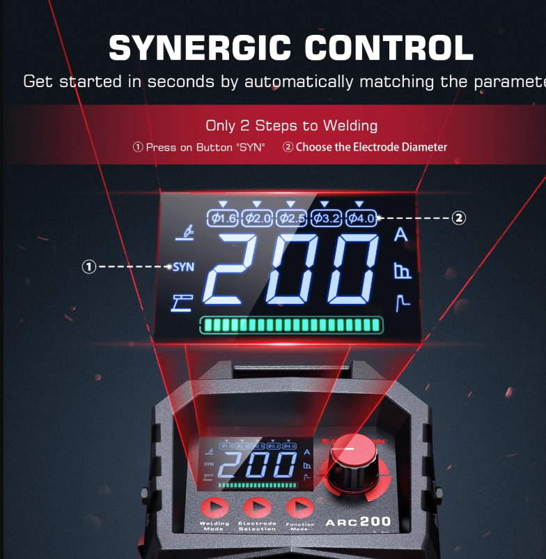 - Synergic Control: Automatically matches current and voltage based on welding electrode diameter, ideal for both beginners and professionals.