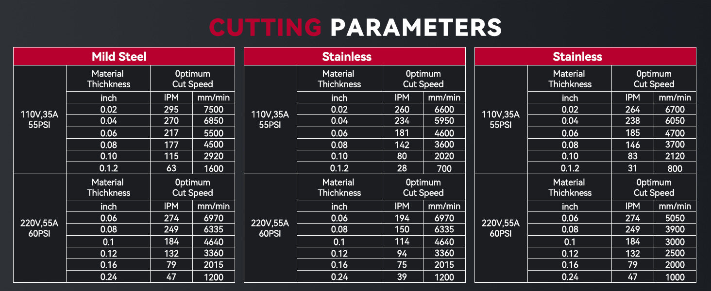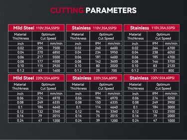 Select proper current according to the cutting parameters table, workpiece material, cutting thickness and cutting speed, etc. (The figure in the below table is an approximation.)