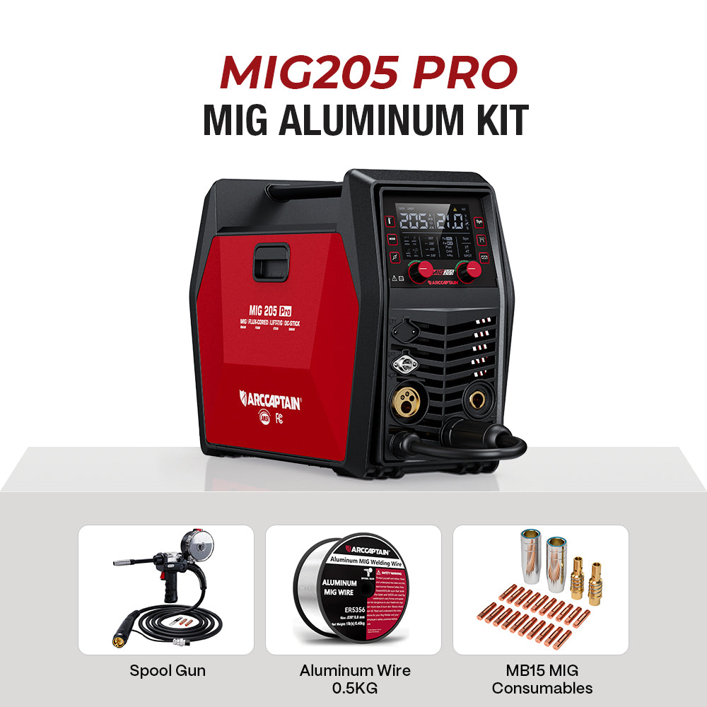 ARCCAPTAIN MIG205 Pro MIG Welding machine has 6 welding modes: Gas MIG/ Gasless MIG/ MMA Stick/ Lift TIG/Spot Welding/Spool Gun Aluminum Welding (Lift tig torch and spool gun is sold separately)