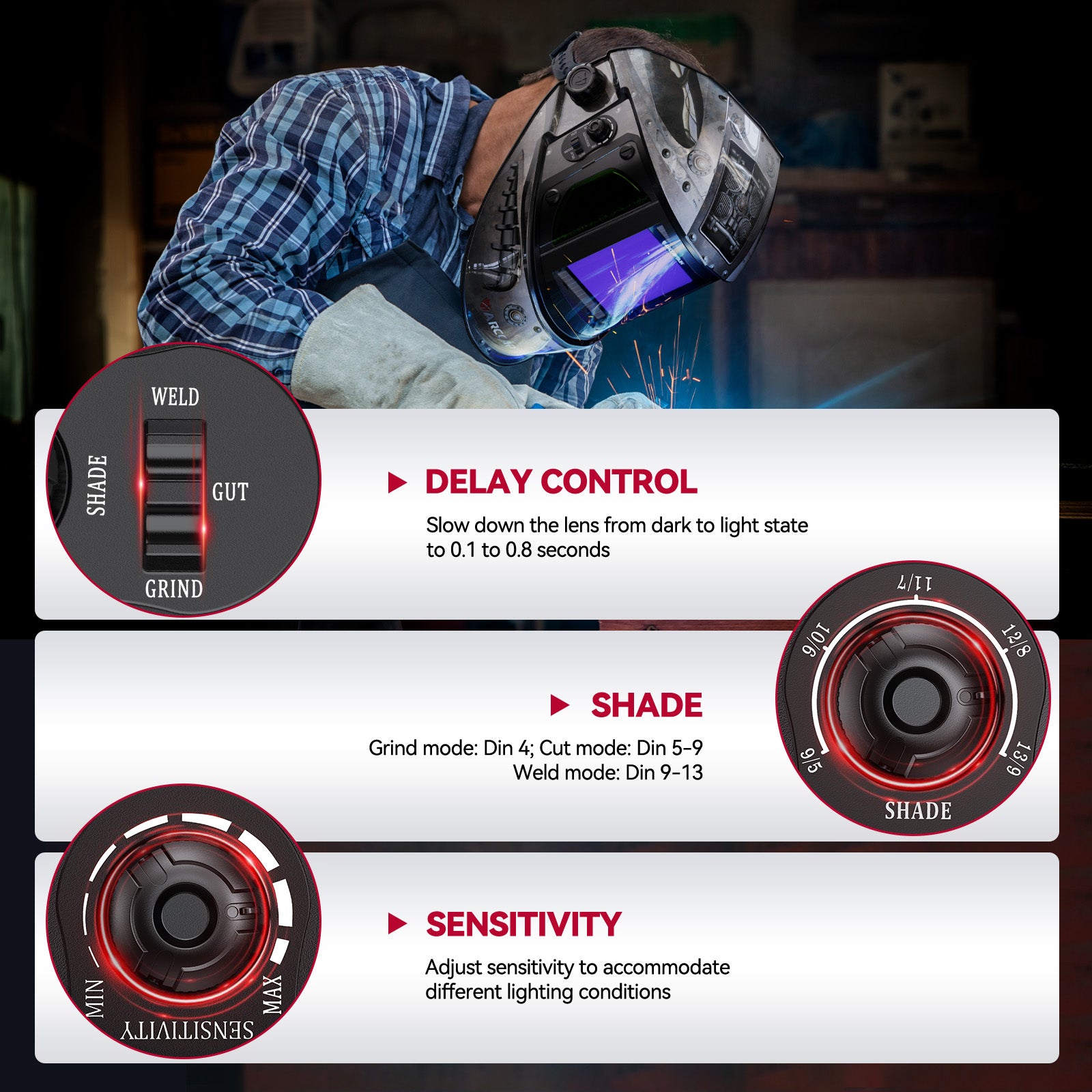 AUTO DARKENING FILTER: This welding helmet features a high-end auto-darkening lens and 4 premium arc sensors, allowing you to adjust the lens's shade and sensitivity for different working environments during ARC/MIG/TIG Welding. It provides DIN4 on light state and DIN5-9/9-13 on dark state.