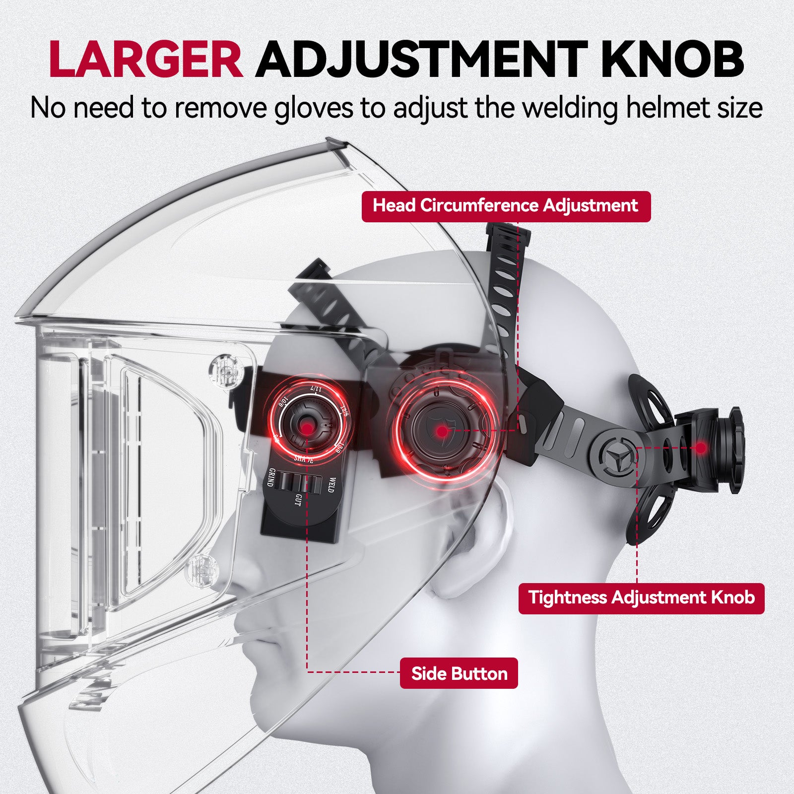 Variable Shade with External Infinite Adjustment: Seamlessly switch between DIN5–9 and DIN9–13 with stepless external control, enabling precise darkness level selection for MIG, TIG, Stick welding, and plasma cutting. Adjust on the fly without lifting your hood.