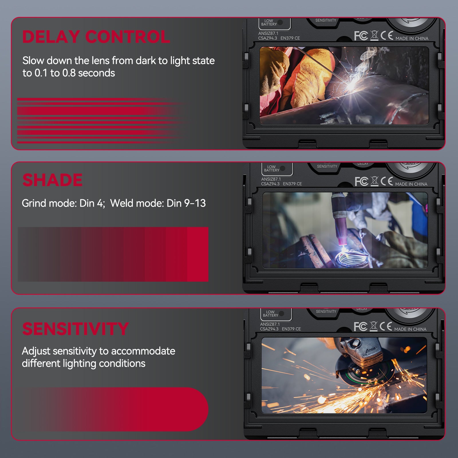 Equipped with high-end auto-darkening lenses and four premium arc sensors, the welder helmet transitions from light to dark in just 1/25,000 seconds. The lens brightness and sensitivity are easily adjustable, making it perfect for TIG, MIG, ARC welding, and grinding. Light state: DIN 4; Dark state: DIN 5-9/9-13.
