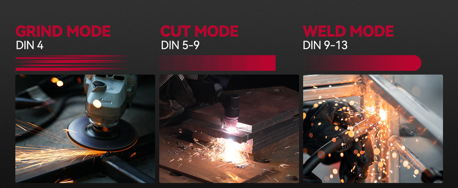 - Auto-Darkening Precision – Lightning-fast 1/25,000s switching speed with adjustable DIN 4–13 shade range for eye protection in MIG, TIG, Stick, and grinding modes.