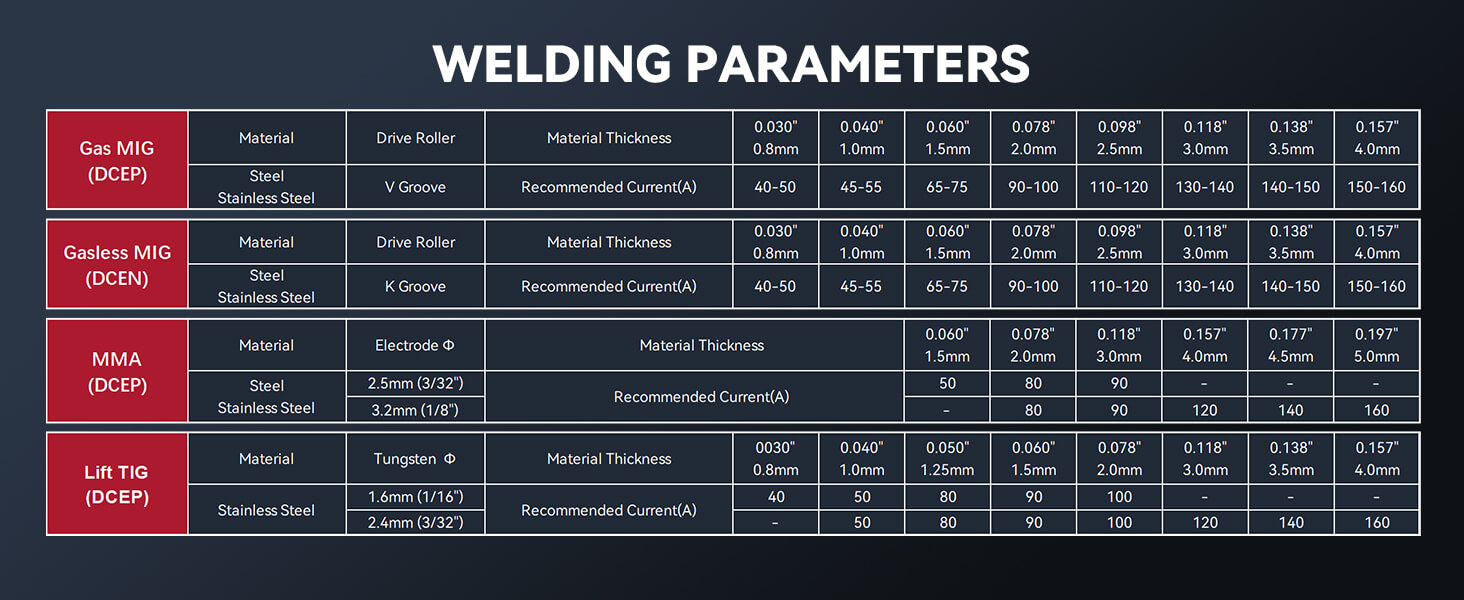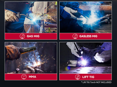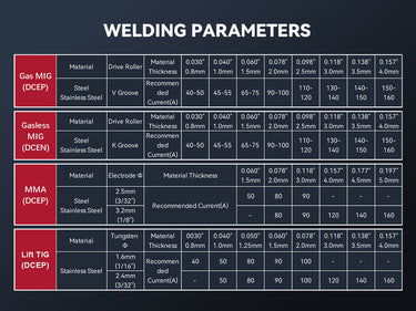 The MIG160 Dual Voltage welding machine is your all-in-one solution for a variety of welding needs. With 4 welding modes—Gas MIG, Flux Core Gasless MIG, Lift TIG, and Stick (MMA)—this welder adapts to any project. Note: Lift TIG torch sold separately.