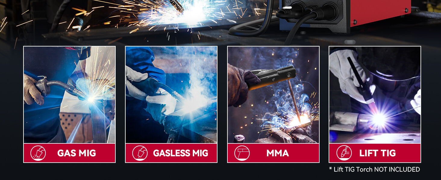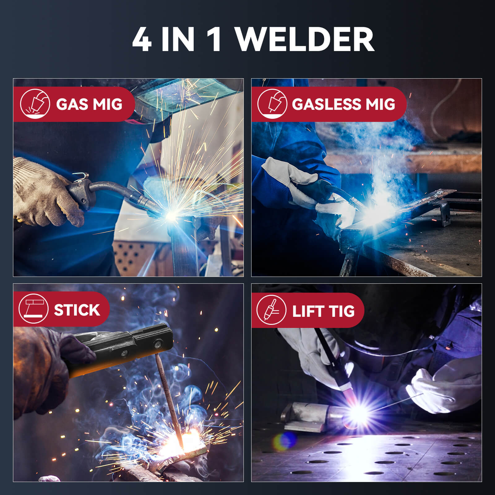 - 4-IN-1 Welder: The MIG160 offers 4 welding modes: Gas, Flux Core Gasless MIG, Lift TIG, and MMA, perfect for welding carbon steel, stainless steel, and thicker metals. Ideal for home DIY, outdoor repairs, farm and equipment maintenance.