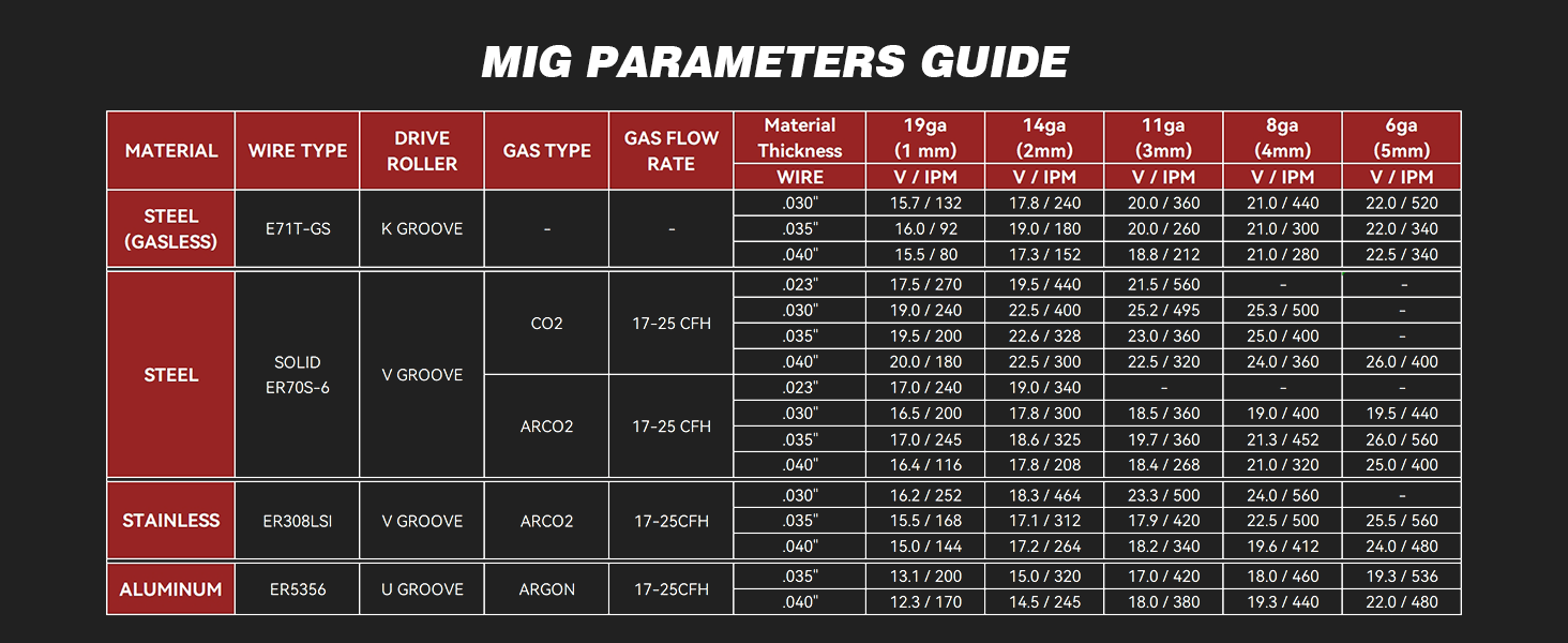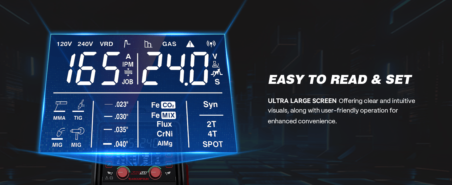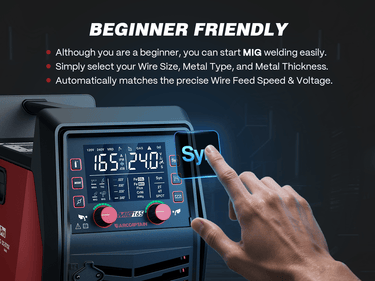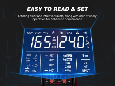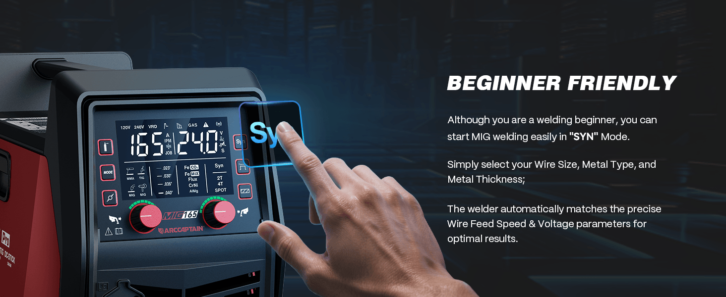 - SYN Technology: Features SYN for automatic matching of wire feed speed, and current. Adjust one parameter to start MIG welding in three steps.