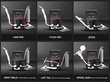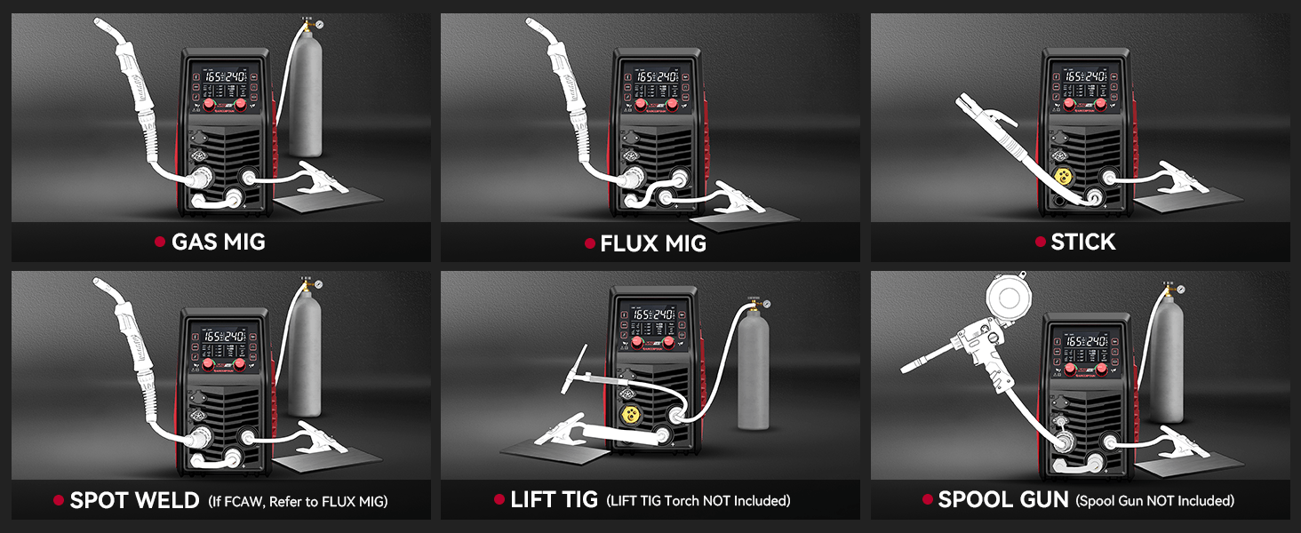 - 6 in 1 Welding Modes: Supports 6 welding modes (MIG, FLUX, TIG, MMA, SPOT, SPOOL GUN) to meet various work needs.