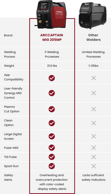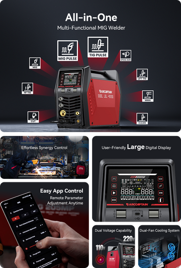 Combining MIG, Pulse MIG, TIG Pulse, MMA, Plasma Cutting, Flux-Cored, and Cleaning in one compact machine, the ARCCAPTAIN MIG205MP offers high-frequency TIG start, foot-pedal control, and efficient cooling for precision and reliability on every job.
