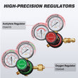 Everything you need is included: torch handle ×1, cutting attachment ×1, #6 heating tip ×1, 1-3-101 cutting tip ×1, welding tips (#0, #2, #6) ×3, flashback arrestors ×2, 15 ft oxygen and acetylene hoses ×1, oxygen & acetylene regulators ×1 each, goggles ×1, striker ×1, wrench ×1, tip cleaner ×1, O-rings ×2, and a carrying case ×1. This all-in-one kit ensures fast, efficient work and is perfect for both beginners and experienced users.