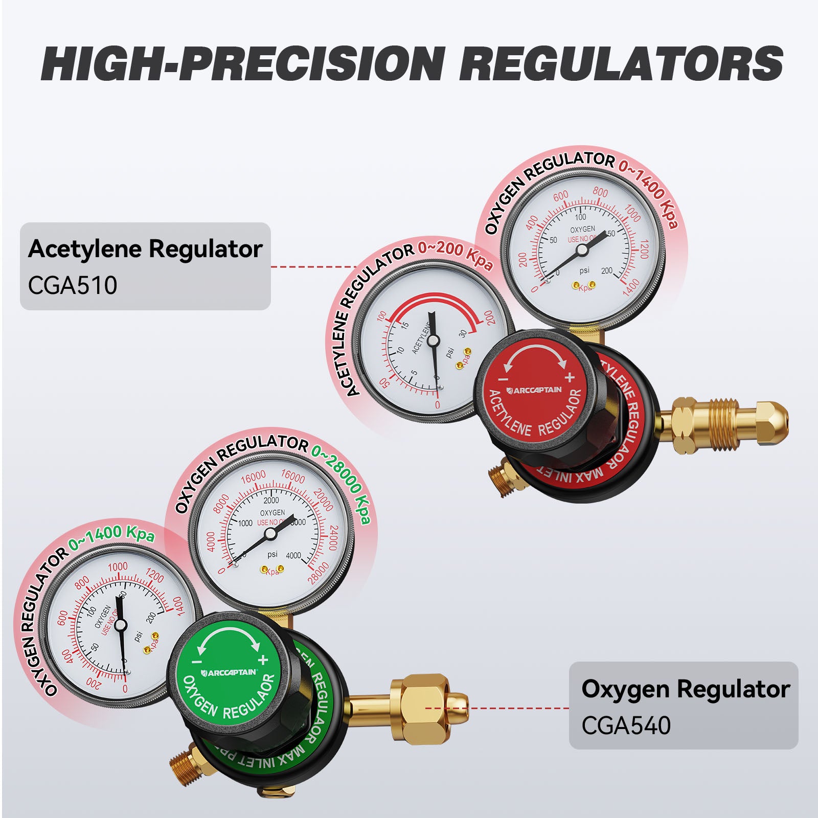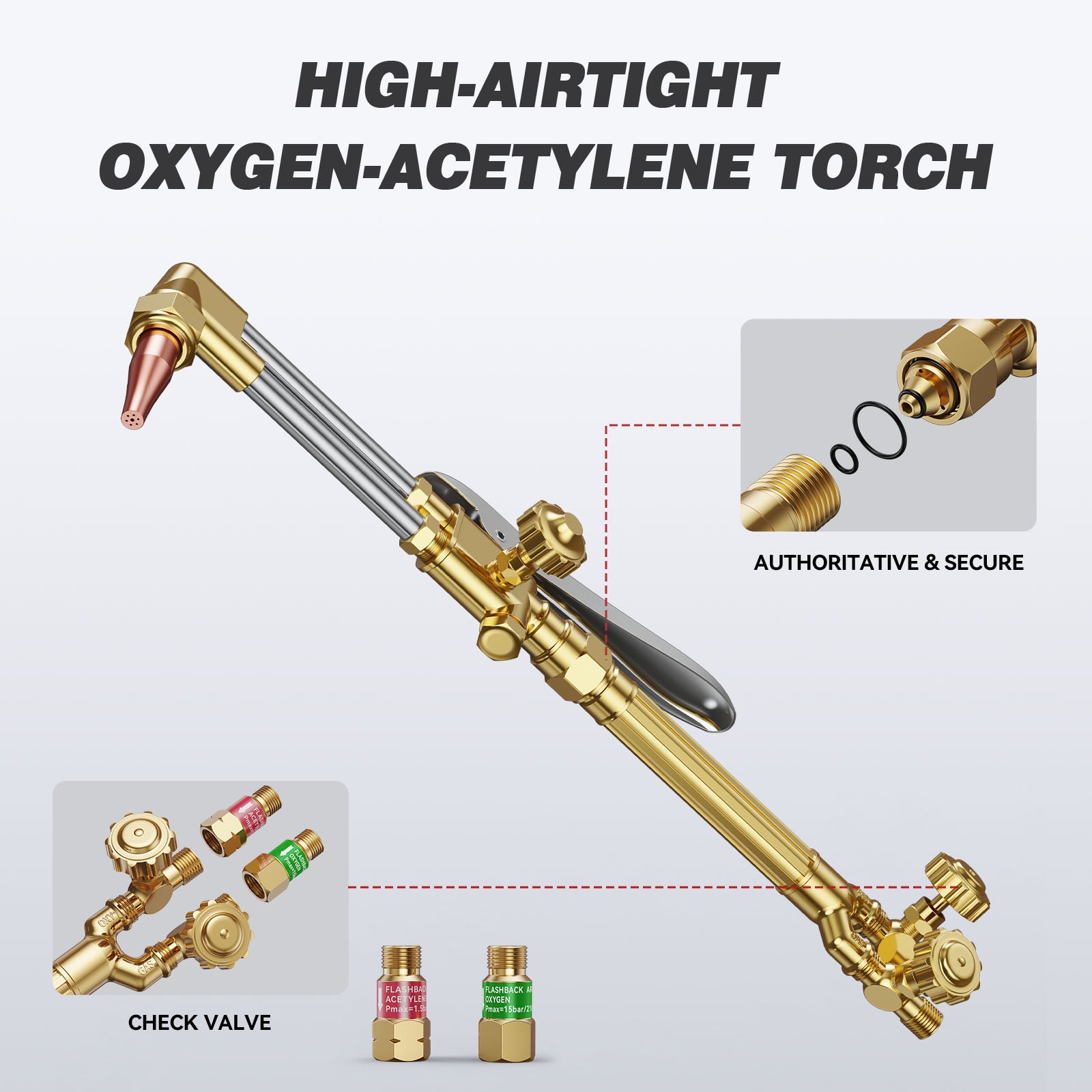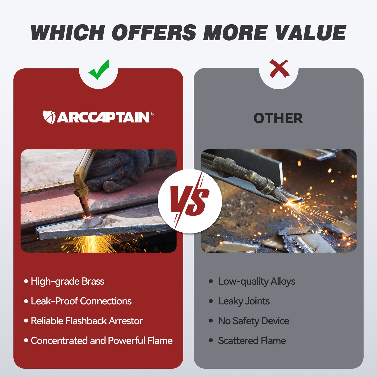 The ARCCAPTAIN oxy-acetylene torch is built with premium components including solid brass valves, stainless steel pressure handle, integrated control knobs, and stainless steel valve stems for superior durability and precise control. Equipped with the 1-101 cutting tip, it can cut up to 4.7" (120mm) carbon steel and weld up to 2" (52mm). Ideal for cutting, welding, brazing, and soldering tasks, making it perfect for DIYers, workshops, and farm repairs.