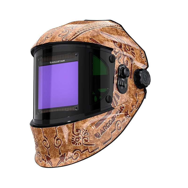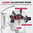 Experience an expansive field of view with a 3.94" x 7.06" screen, featuring a 3.94" x 3.66" auto-darkening area (DIN 16) and two non-auto-darkening side views (3.94" x 1.70", DIN 5). This full-vision design improves welding accuracy and control by providing complete visibility around the welding area.