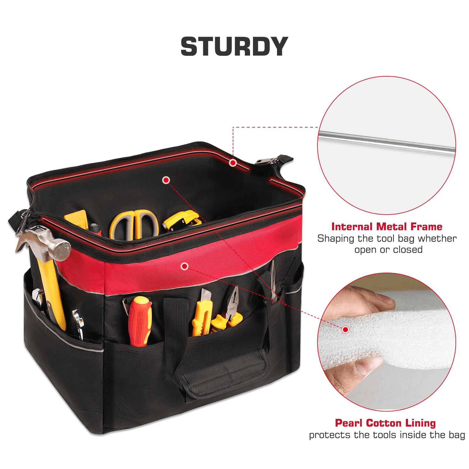 【Rugged Durability】Constructed with durability in mind, our tool bags feature wide open mouths with internal metal frames for effortless organization. Filled with pearl cotton, these bags maintain their shape and protect against external impacts, ensuring long-lasting performance in any environment.