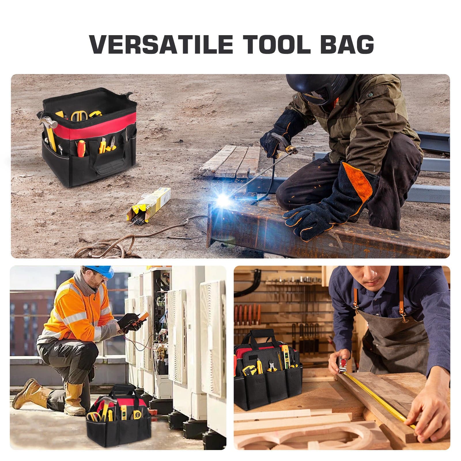 【Enhanced Safety Features】Equipped with reflective strips, our tool bag organizers ensure visibility during nighttime tasks, promoting safety and ease of locating tools in low-light conditions, whether you're working with welding equipment or performing electrician tasks.